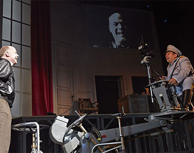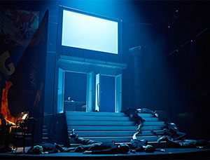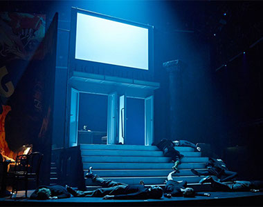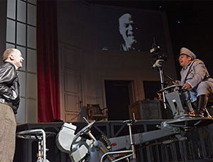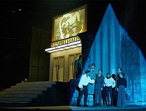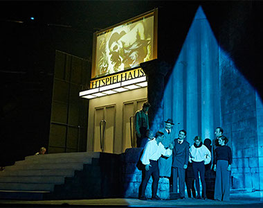 Auf dem schwarzen Klavier in der Ecke flackern Kerzen, über den Köpfen bahnt ein übergroßer King Kong* sich seinen zerstörerischen Weg durch die Welt. [*Originalfilmplakat von 1933, „King Kong“ war der heimliche Lieblingsfilm von Adolf Hitler. N.T.] Der ernsten Parabel über das Verhältnis von Kunst und Macht setzen Bühnenbildnerin Nicole Timm und Videokünstler Jan Speckenbach Räume entgegen, die an die Ausgelassenheit der Goldenen Zwanziger erinnern. —NDR Kultur